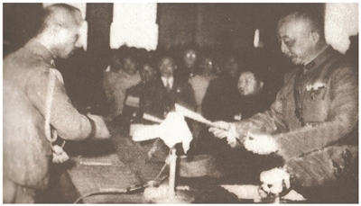 1945年10月25日,中国战区台湾省受降主官陈仪(右一)接受日本投降代表的投降书。中国闽台缘博物馆供图